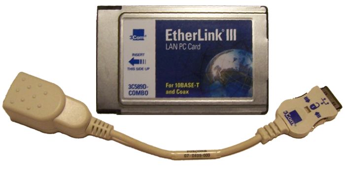 3Com 3C589D P/N 16-0037-000 EtherLink III LAN 10Base-T and Coaxial PCMCIA PC Card with male connector Cable-Dongle